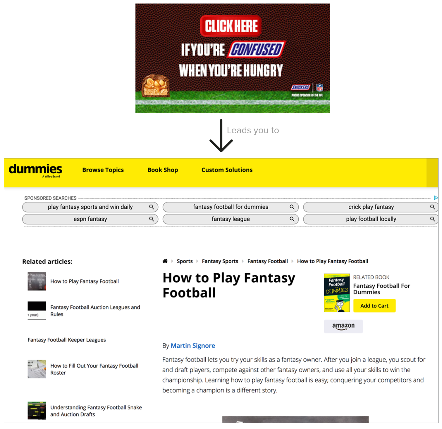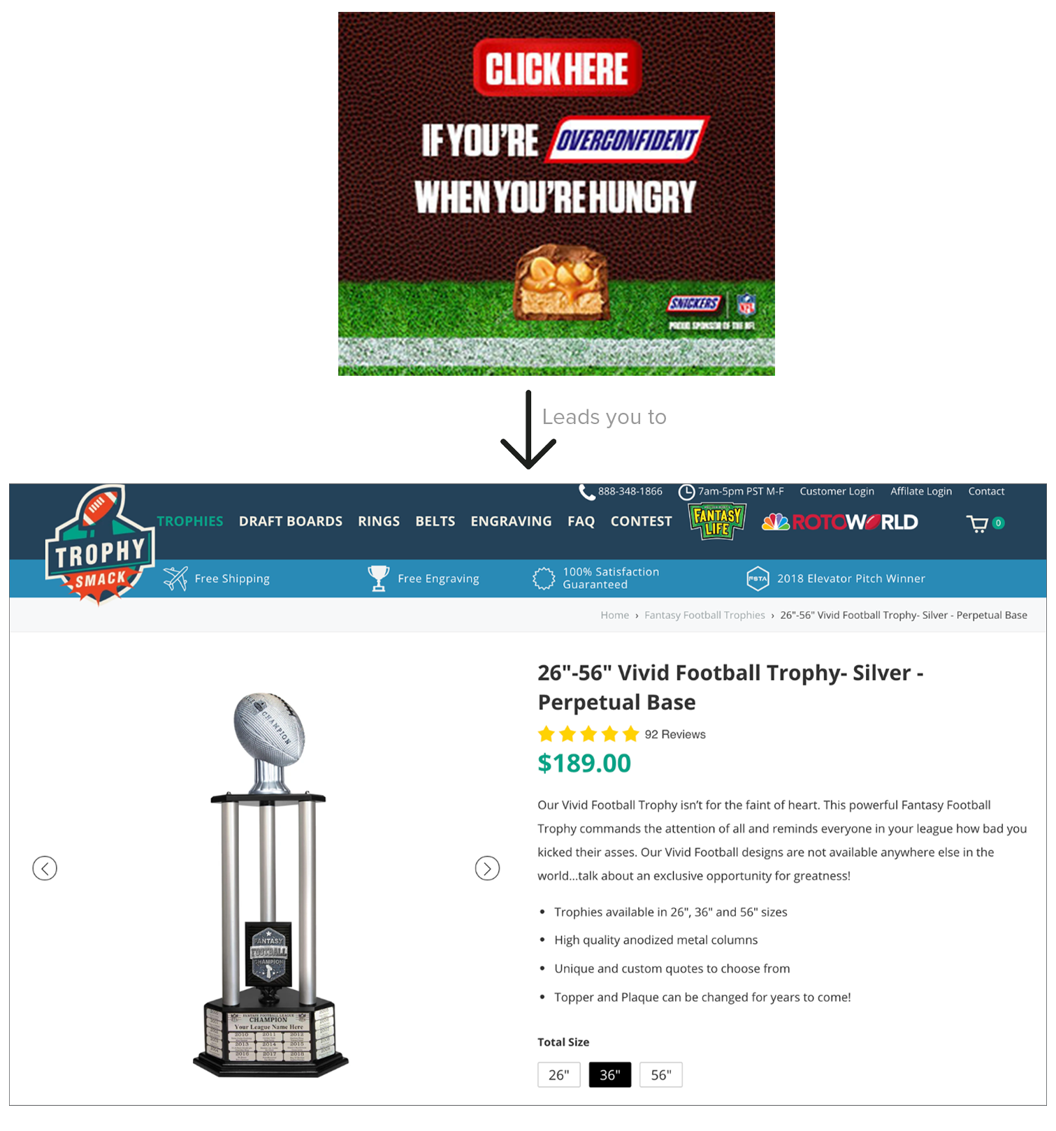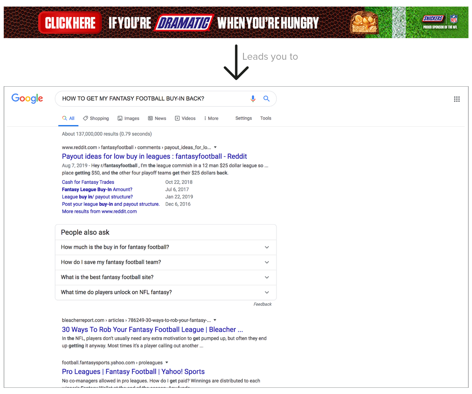 For Snickers' partnership with the NFL, in stadium banner ads as well as clickable banners in the ESPN Fantasy Football App that lead users to a comedic surprise.